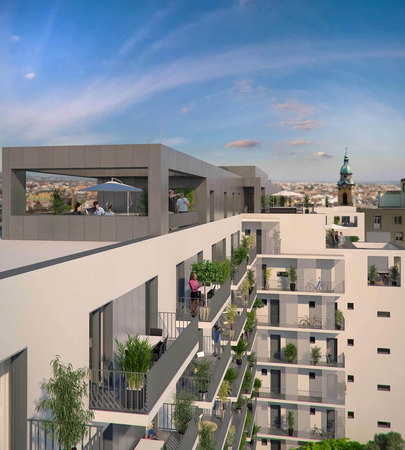 Szinte minden lakás kifejezetten napos, hiszen délkeletre vagy délnyugatra néz. A lakások nagy részéhez terasz is tartozik, amit kifejezetten használható méretűre terveztünk. A mélygarázson kívül pedig bicikli tároló is tartozik a házhoz, hogy még kényelmesebb legyen a városi élet. A ház két ütemben épül, az első ütem 79 lakásának átadása 2018 december.